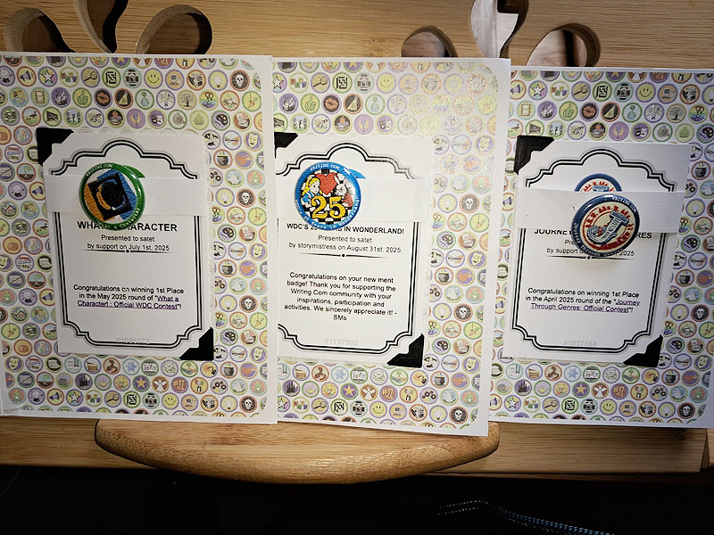 | I have had the most craptastic past week fighting with the flu (cough, cold, the works). I have to return to work tomorrow, so I'm doing my best to get myself together. This includes finally getting my tush off the bed and doing some cleaning around the place. So, as I head outside to toss out the trash - there comes the smiley Royal Mail lady with three little envelopes in her hand. I'm thinking it's going to be for one of my housemates and prepare to leave it on the usual mail spot in the lobby, but then I look down and see the familiar Writing.com logo and my name on the envelopes! Might seem trivial, but while in the States, getting such mail was always fun. However, traveling around so much these past few years - not by choice - but that's another story for another time, and finally seeing these gems in the mailbox, again, seriously brought tears to my eyes. I was definitely not expecting them (or rather completely forgot this was still done), so my sincerest thanks to The StoryMaster |